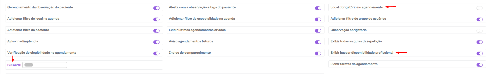 Outras opções relevantes são a de exibir a disponibilidade profissional, exibir as tarefas no agendamento, verificar a elegibilidade no agendamento e de tornar o preenchimento do campo "Local" ser obrigatório no agendamento.