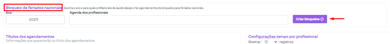 Esta opção permite que sejam criados bloqueios automaticamente para os feriados nacionais na agenda dos profissionais desejados.