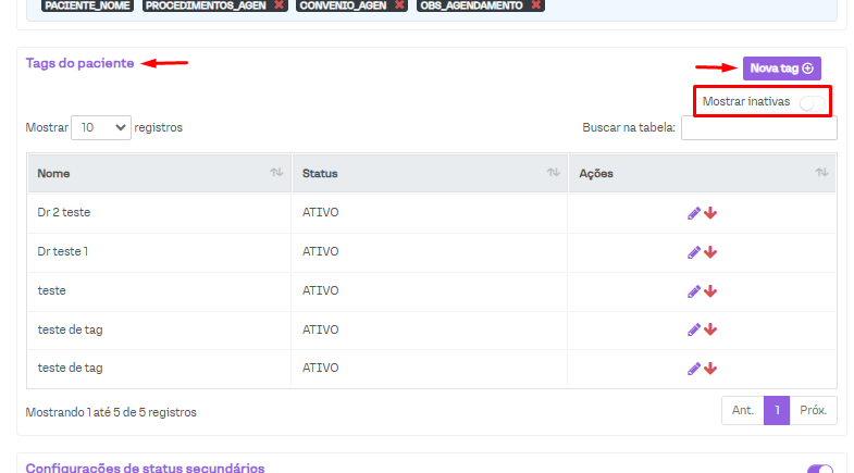 O status secundário é utilizado para complementar os status padrões que existem no sistema. Eles podem ser utilizados a fim de criar status personalizados no agendamento que auxiliam no fluxo particular de cada clínica.