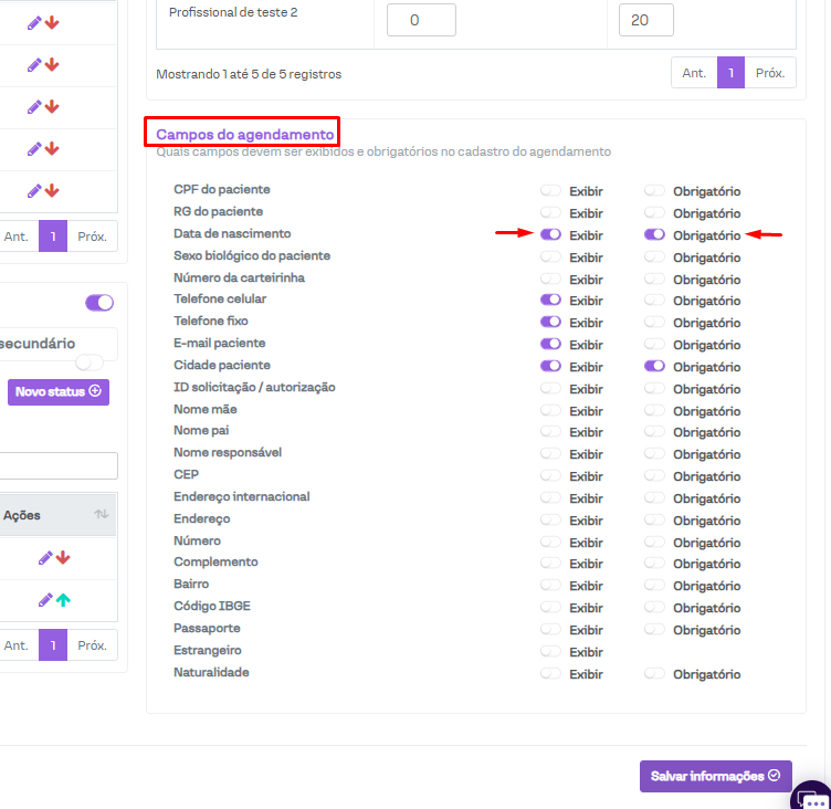 Neste quadro é possível ajustar os campos que são exibidos (a chave antes da opção "Exibir" deve estar em roxo) ou não, no momento de criar um novo agendamento. Também é possível ativar a opção "Obrigatório", o qual não permite a criação do agendamento sem que esta informação seja inserida.