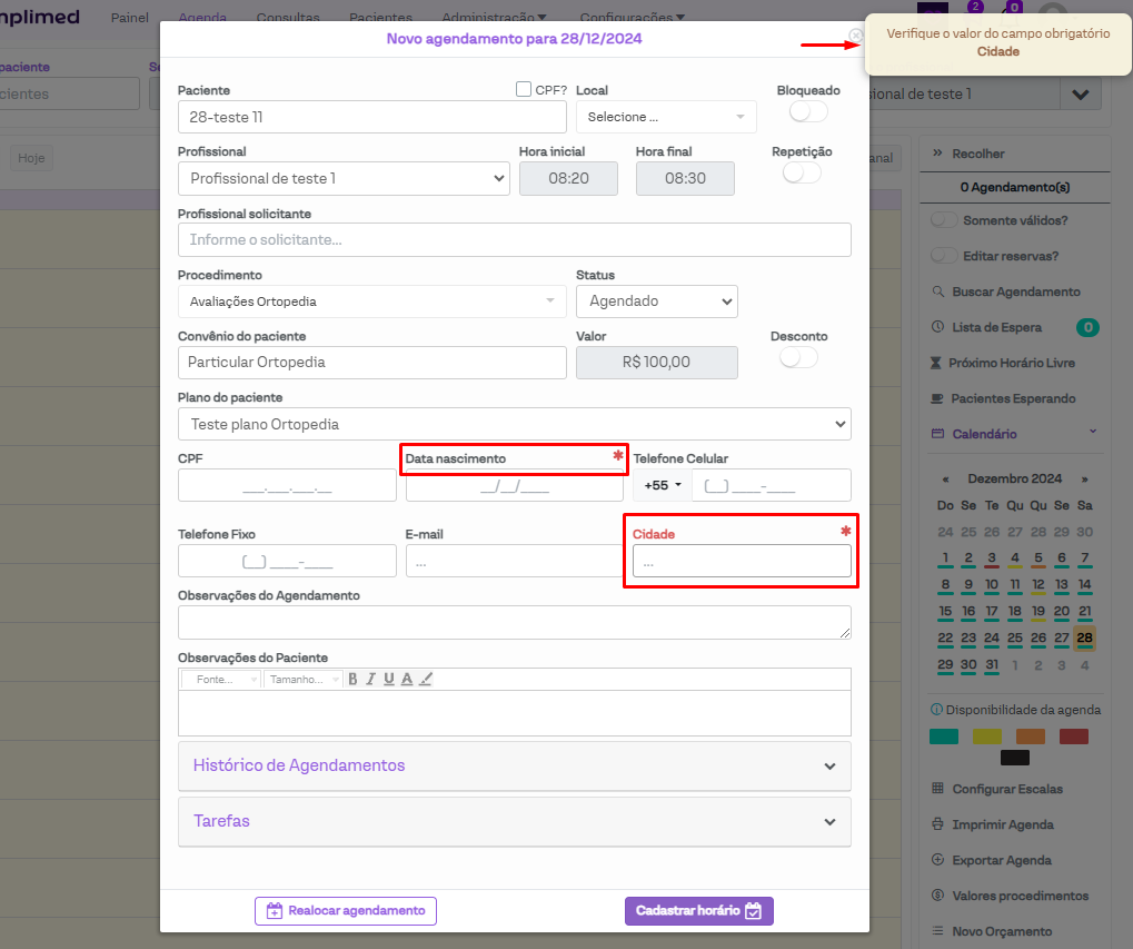 Por exemplo, ao tentar cadastrar um novo agendamento com as configurações exibidas na imagem acima, sem o preenchimento da opção "Cidade" e "Data nascimento", não será possível criar o agendamento.
