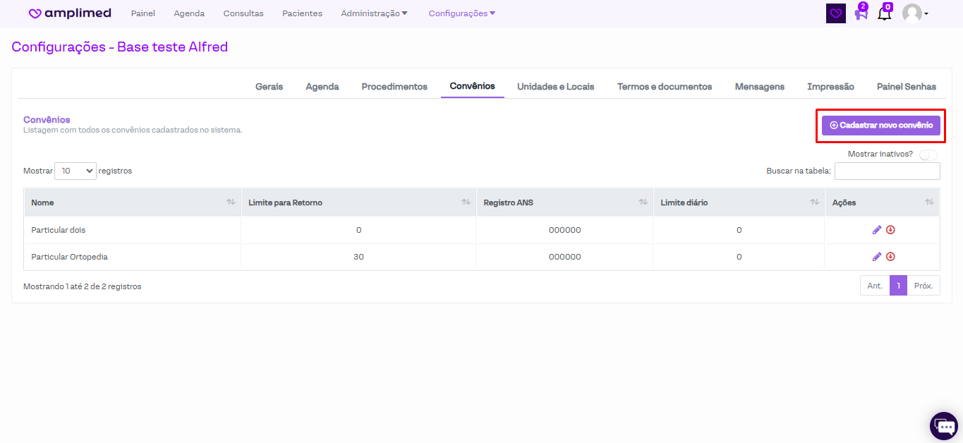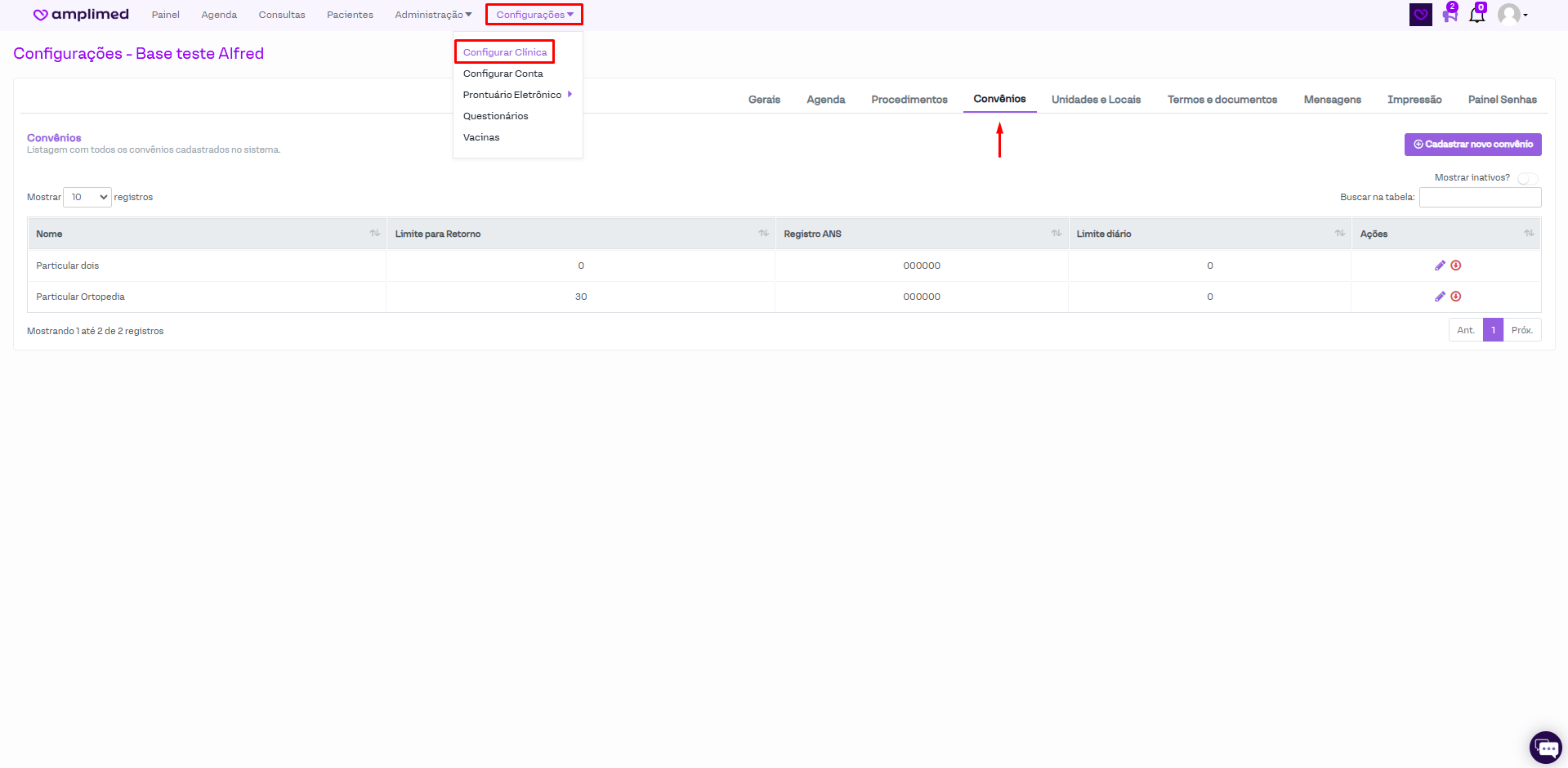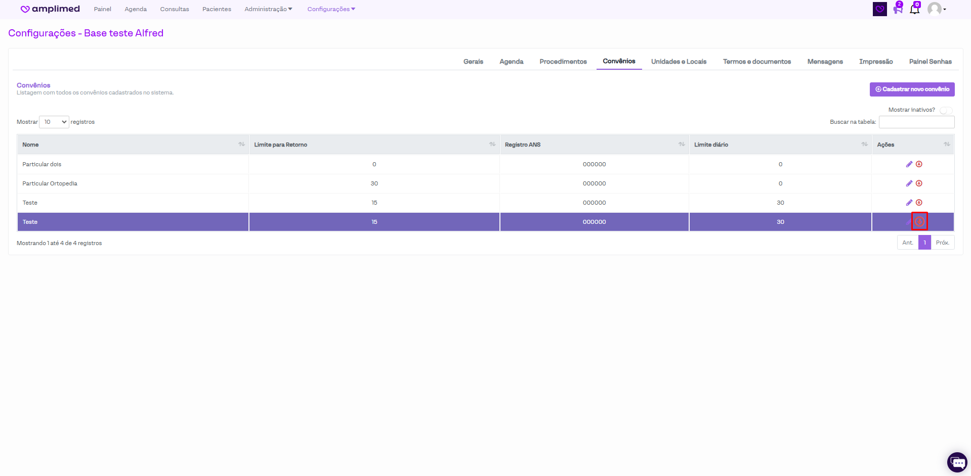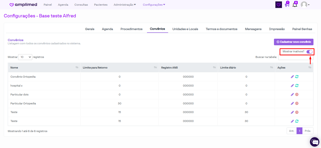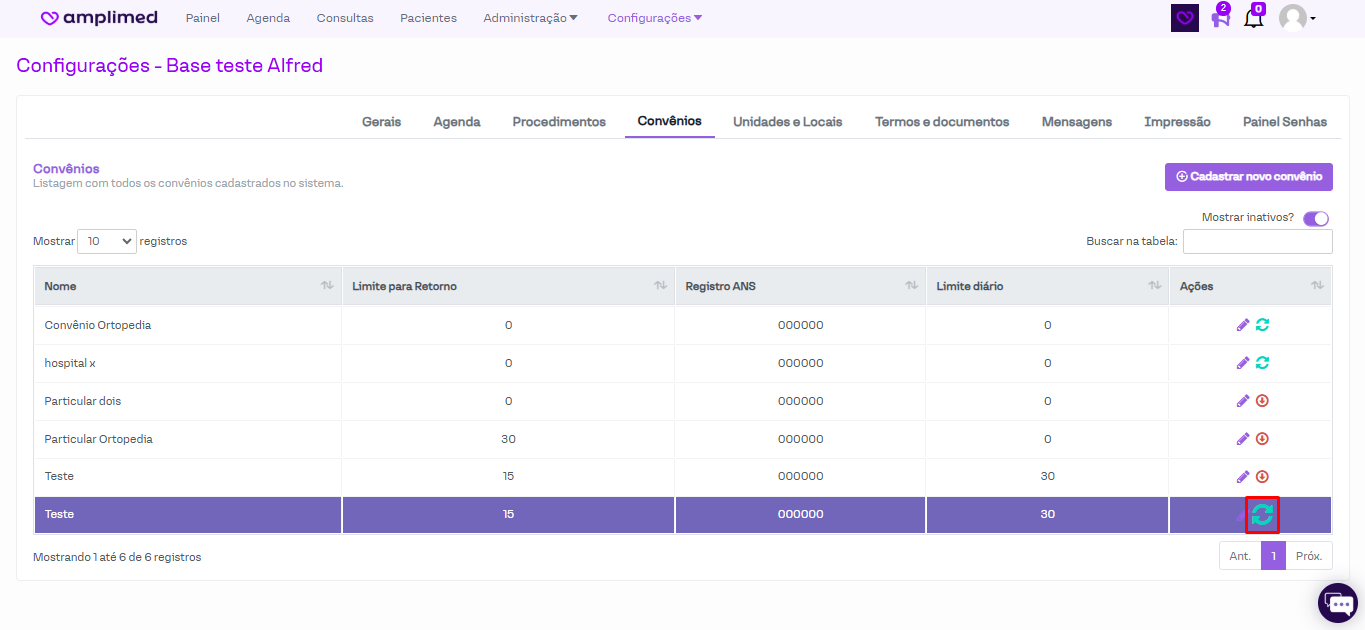 Após isto, o convênio estará ativo novamente para que você possa utilizá-lo em sua clínica.