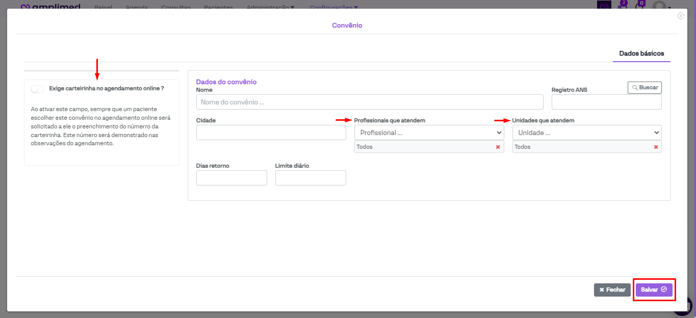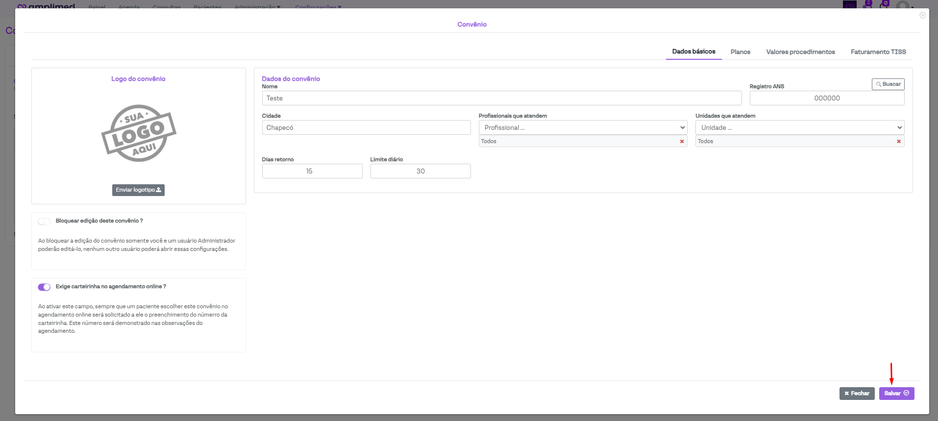 Outra opção importante na criação do convênio é "Exige carteirinha no agendamento online?", o qual tem por função exigir o preenchimento do número de sua carteirinha, quando o paciente selecionar este convênio ao realizar o agendamento online.