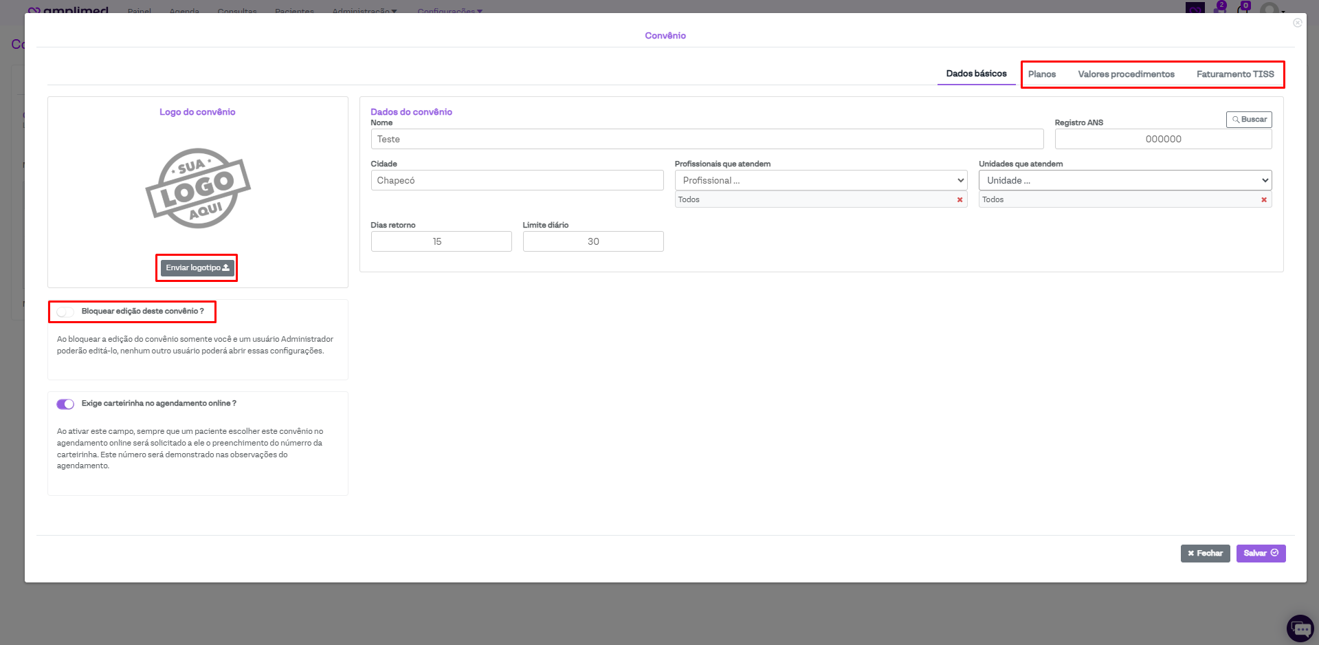Após ser criado, novas abas serão exibidas para configurar o seu convênio conforme a necessidade de sua clínica.