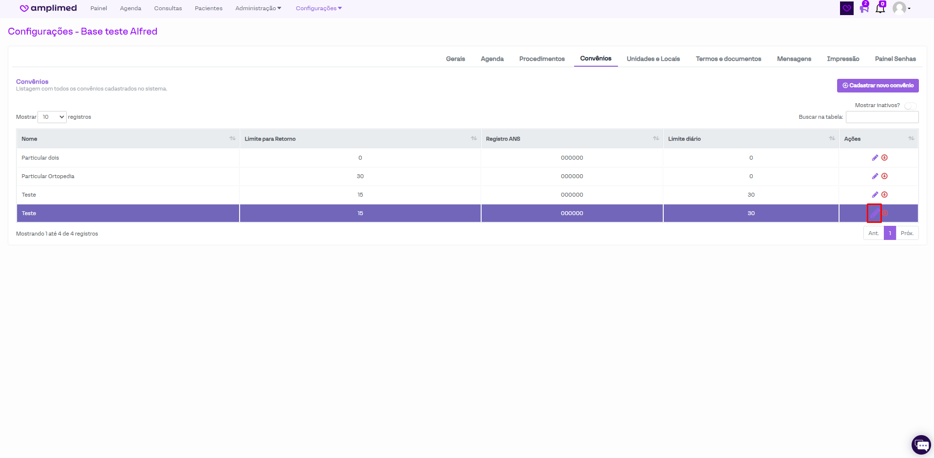 A edição de um convênio também pode ser realizada de forma simples e rápida. Para isso, selecione o convênio que deseja editar e clique no ícone de lápis, em roxo, localizado à direta da tela.