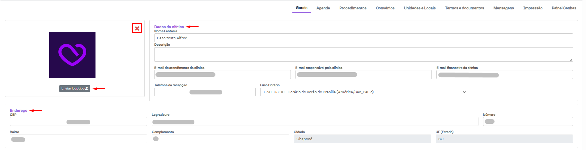 Além destas informações, é possível adicionar a logo da sua clínica. Para isso, basta clicar em "Enviar logotipo" e selecionar a imagem desejada em seu computador. Caso precisar remover a imagem, basta clicar no ícone do "X", em vermelho, localizado pouco acima da logo à sua direita.