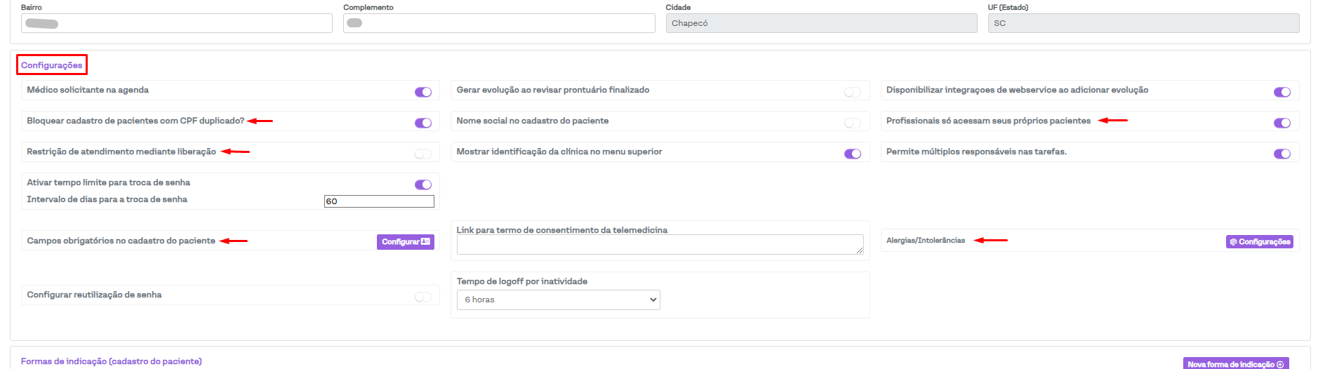 Campos obrigatórios no cadastro do paciente: permite configurar quais campos serão obrigatórios o preenchimento para que o cadastro seja criado. Temos um artigo completo sobre os campos obrigatórios do cadastro do paciente, caso ajudar: Campos Obrigatórios no Cadastro do Paciente
