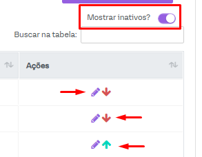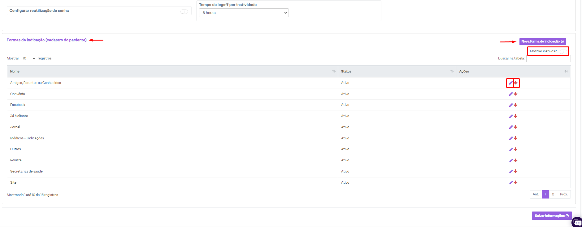 Já para gerenciar as formas de indicação, na coluna de "Ações", haverá um ícone de lápis em roxo, para que sejam realizada a edição de uma forma cadastrada. Para desativar uma opção, basta clicar na seta apontando para baixo, em vermelho. E para reativar uma opção, primeiro ative a função "Mostrar inativos", encontre a forma de indicação que estava desativada e clique na seta apontando para cima, em verde.
