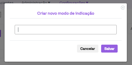 Para adicionar uma nova opção, clique no botão "Nova forma de indicação", à direta da tela. Em seguida preencha o nome do novo modo e clique em "Salvar".