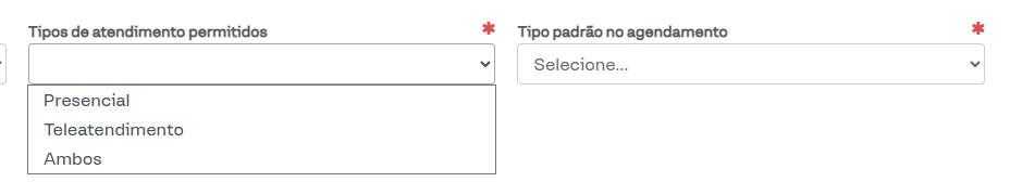 Também haverá a opção "Tipos de atendimentos permitidos" o qual configura se o procedimento poderá ser atendido por teleatendimento, presencial ou ambos. Já a opção "Tipo padrão no agendamento" dirá qual tipo virá selecionado como padrão no agendamento, podendo ser alterado posteriormente.