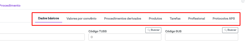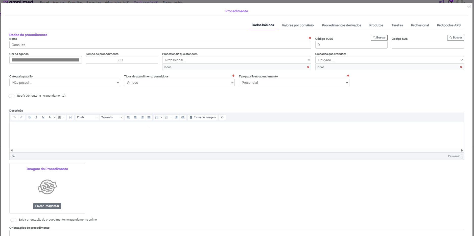 Além dos "dados básicos" de seu procedimento, também há a possibilidade de configurar os Protocolos de Atenção Primária à Saúde (APS) caso sua clínica utilize e este procedimento precise ter o protocolo.