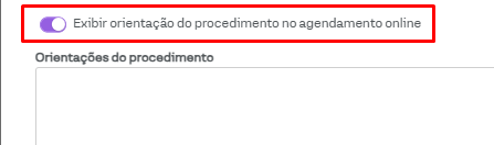 Em casos que este procedimento é liberado para o agendamento online e você gostaria que as orientações dele aparecessem para os pacientes, é possível ativar a opção "Exibir orientação do procedimento no agendamento online".