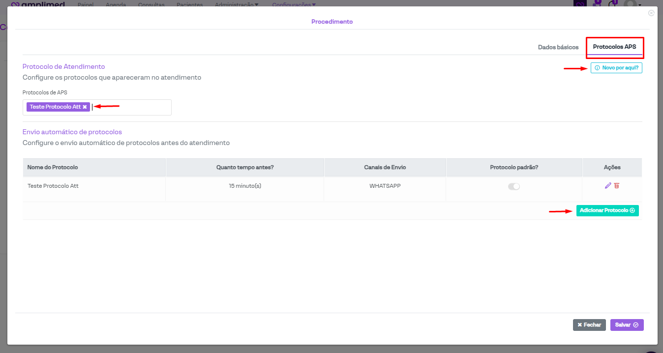Para adicioná-lo, bastar adicionar o nome do(s) protocolo(s) que precisa(m) aparecer no prontuário de consulta, no campo "Protocolo de APS". Depois disso, caso desejar, é possível configurar o envio automático dele para o paciente, para que ele possa preencher com suas respostas. Para isso, basta clicar em "Adicionar Protocolo" e inserir as informações desejadas.