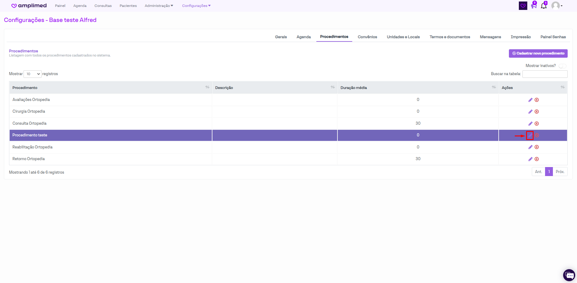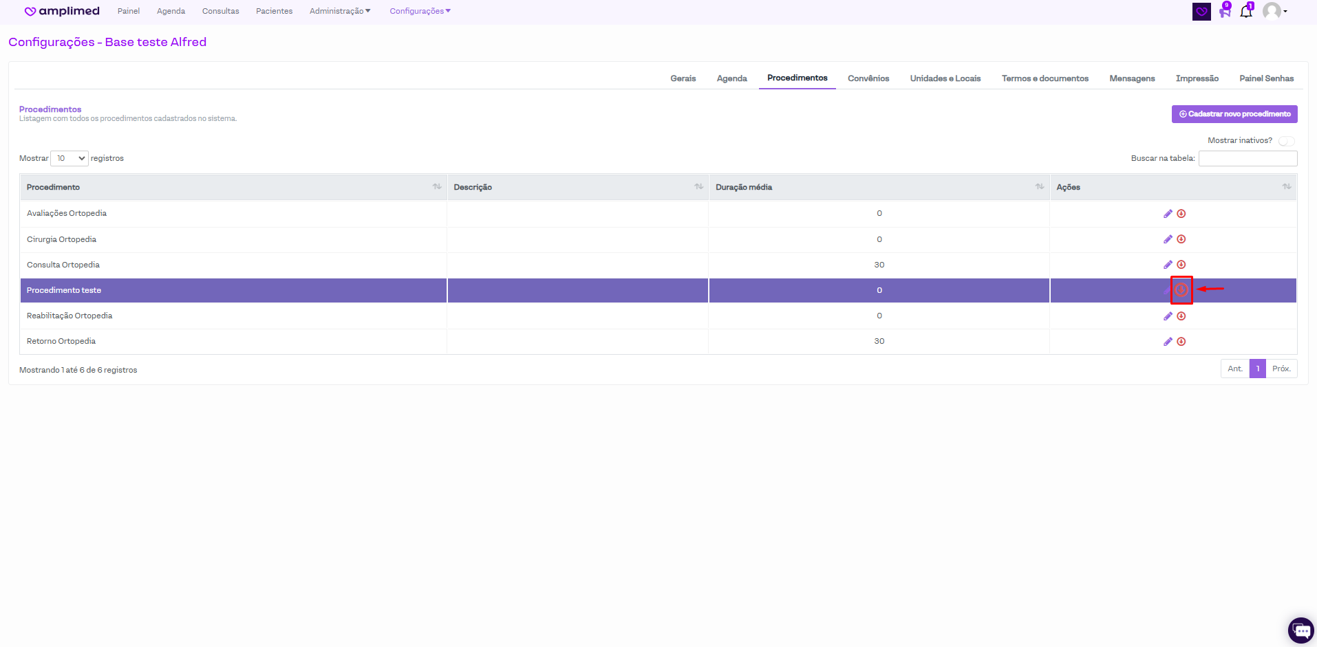 Caso um procedimento não será mais utilizado pela sua clínica, também é possível desativa-lo. Para isso, basta ir na lista de procedimento e encontrar o procedimento desejado e clicar no ícone com uma seta circulada que está apontando para baixo, em vermelho, que irá aparecer no final da linha à direita.