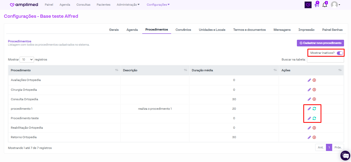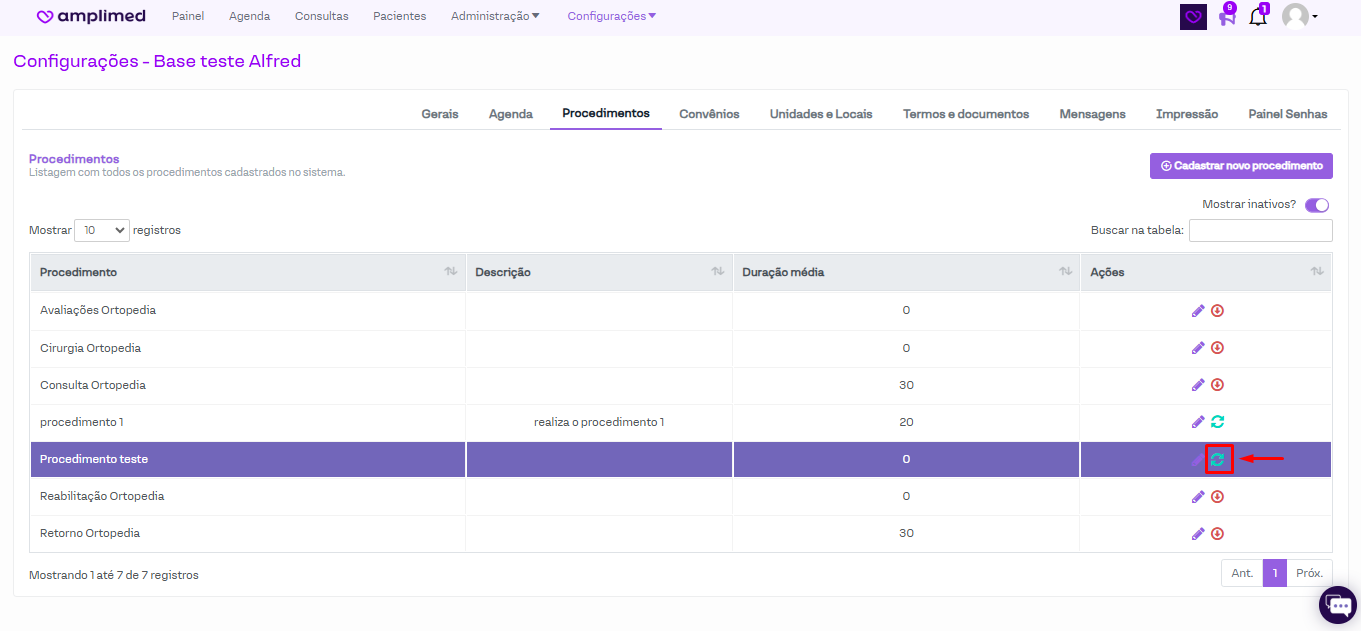 Depois disso, encontre o procedimento desejado e clique no ícone com duas setas circulares, em verde, que irá aparecer no final da linha à direita. Ao clicar, o procedimento será reativado e pode ser usado normalmente.
