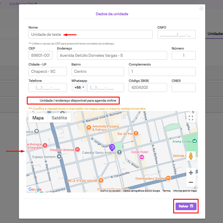 Na nova janela, preencha as informações que serão solicitadas conforme a localização da sua clínica. Após inserir o CEP e o número, o seu endereço será apresentado no mapa. Caso tudo esteja de acordo, basta clicar em "Salvar".