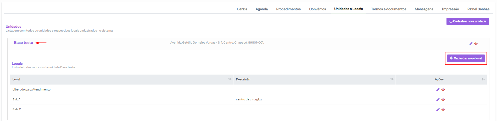 Para criar um local, primeiro clique sobre a unidade que ele irá fazer parte. Será exibido o botão "Cadastrar novo local" e será preciso selecionar ele.