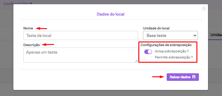 Após ajustadas as configurações do local, clique em "Salvar dados" para concluir a criação.