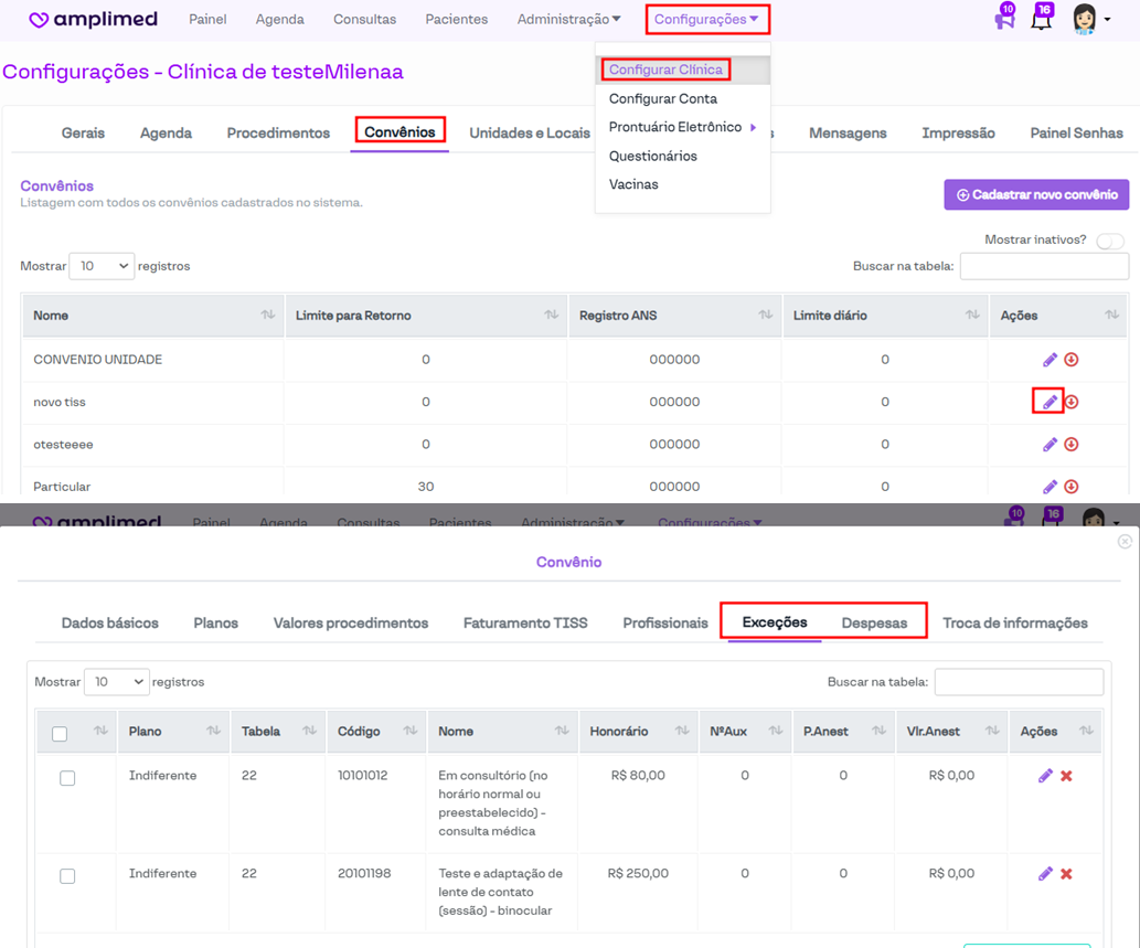 Acesse: Configurações > Configurar Clínica > Convênios > Editar convênio > Exceções/Despesas