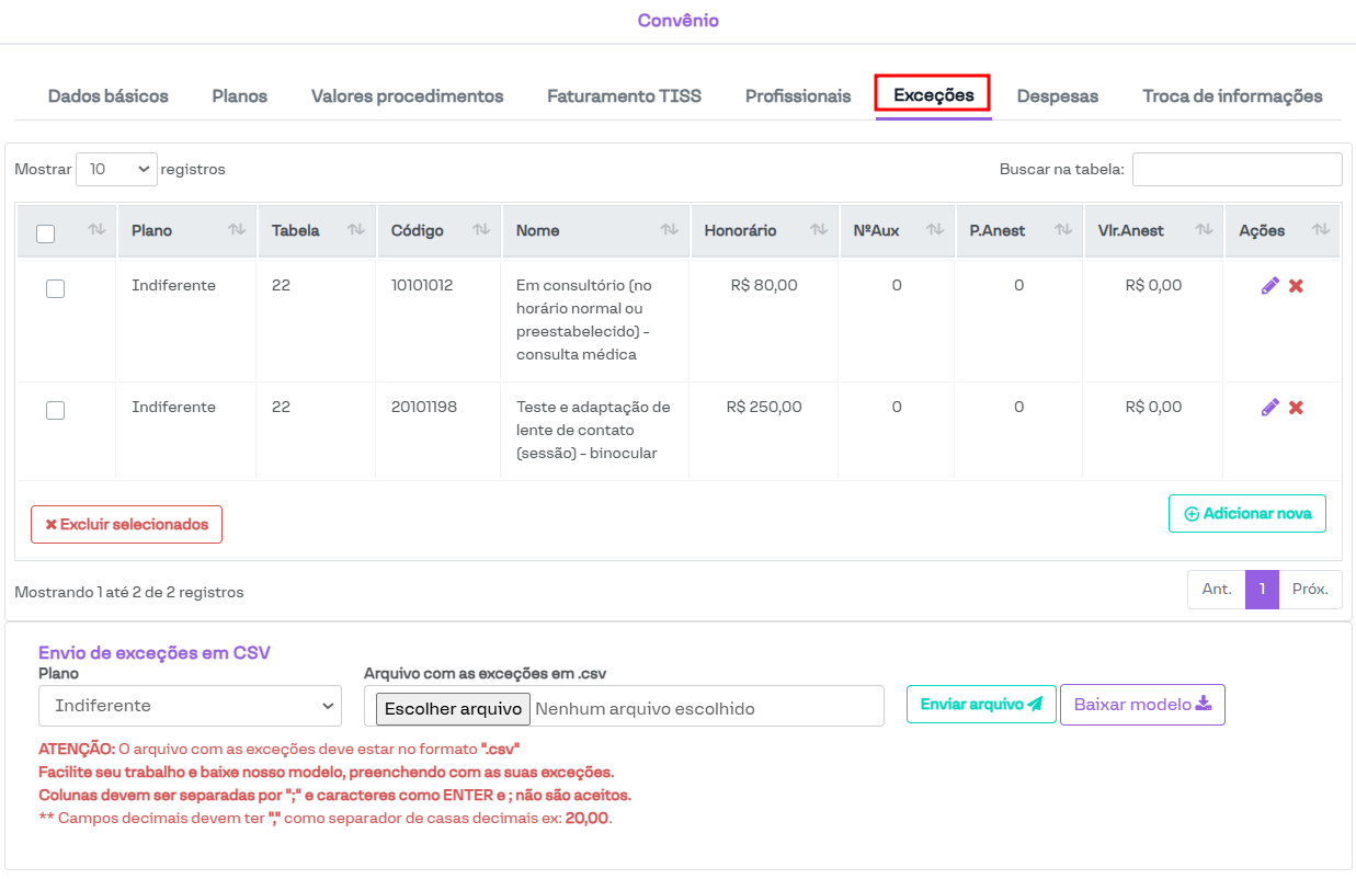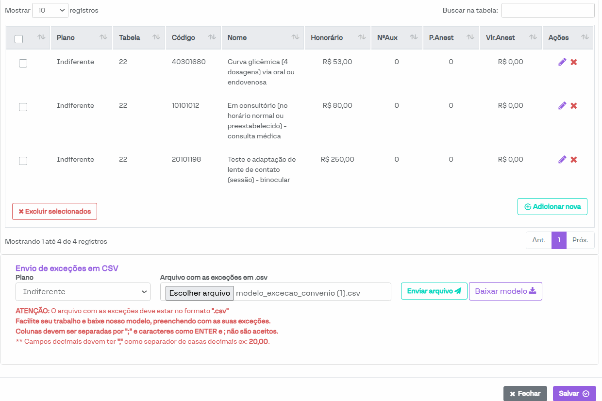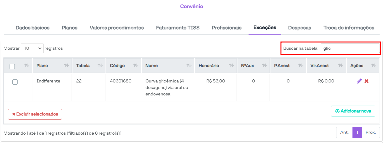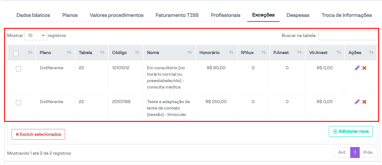 Nesta seção, é possível visualizar e cadastrar procedimentos que não seguem as regras configuradas na tabela de procedimentos utilizada pelo convênio.