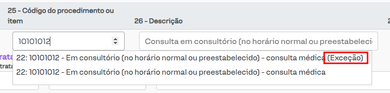 Ao localizar esses procedimentos nas guias, eles serão apresentados com a palavra Exceção ao lado do nome do procedimento, como pode ser visto na figura a seguir.