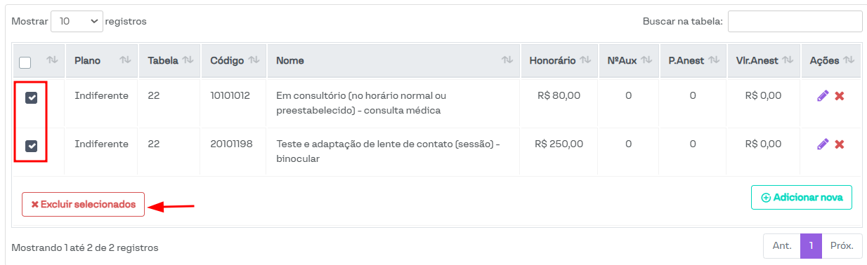 Também é possível excluir vários procedimentos selecionando os campos na coluna à esquerda e clicando no botão Excluir selecionados.