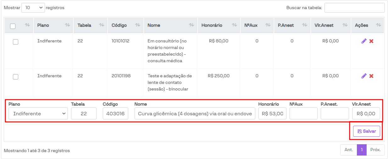 Caso haja muitos procedimentos cadastrados, para buscar um procedimento específico de maneira eficiente, basta utilizar o campo Buscar na tabela, conforme mostrado na imagem abaixo.