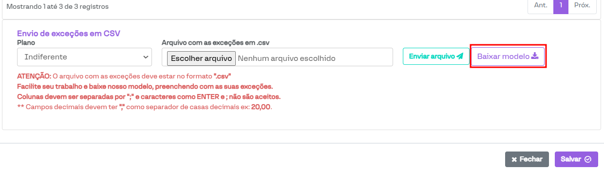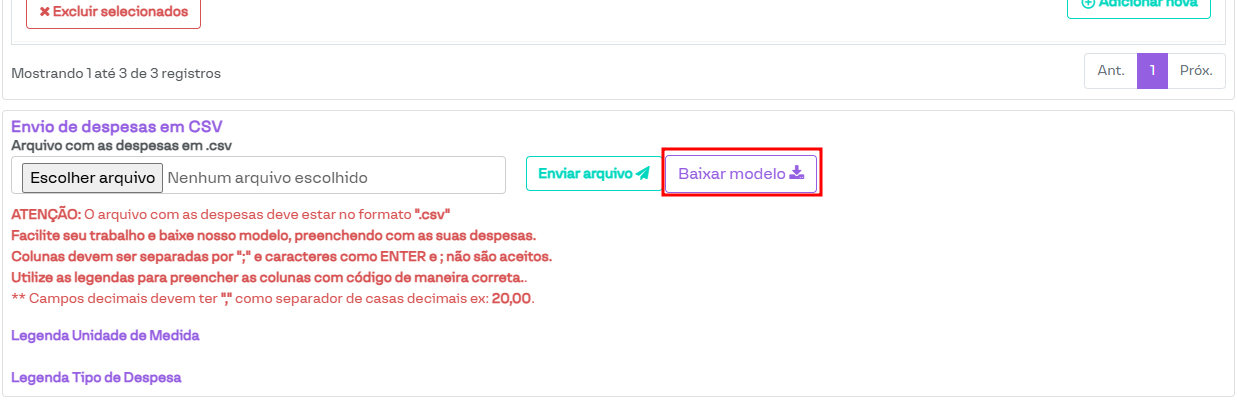 Nesta seção, o sistema permite o cadastro de várias despesas a partir de um arquivo .CSV preenchido conforme o modelo disponibilizado. Para verificar o modelo, basta clicar no botão Baixar modelo, destacado na imagem a seguir.
