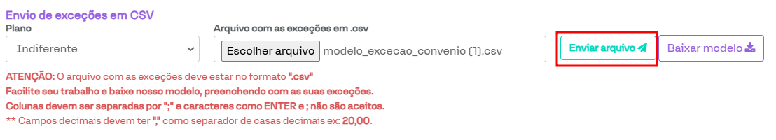 Após verificar que o arquivo CSV segue o modelo selecionado, basta clicar no botão Escolher arquivo, selecioná-lo e, depois, clicar em Enviar arquivo.