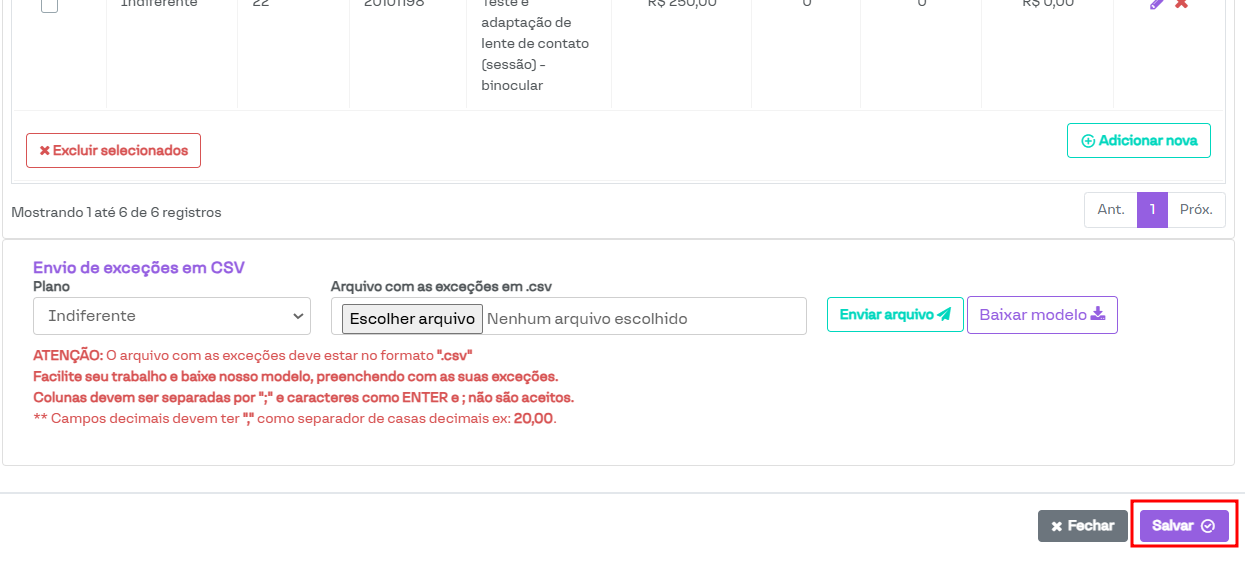 Na seção destacada na imagem abaixo, estão listadas as exceções cadastradas. É possível verificar as informações cadastradas e, na coluna Ações, editar ou remover a exceção cadastrada.
