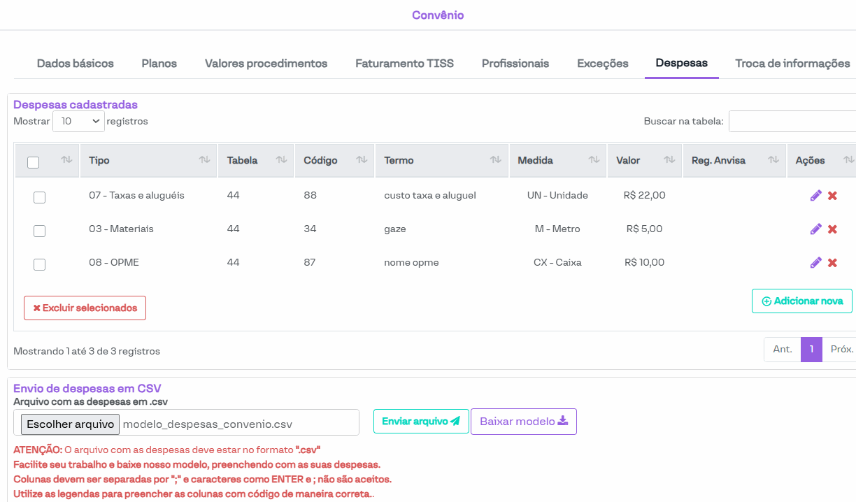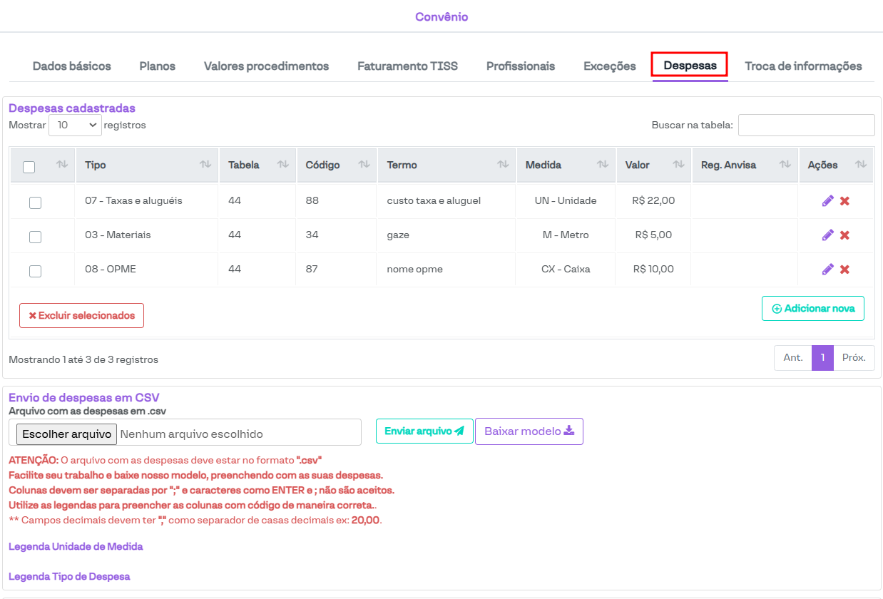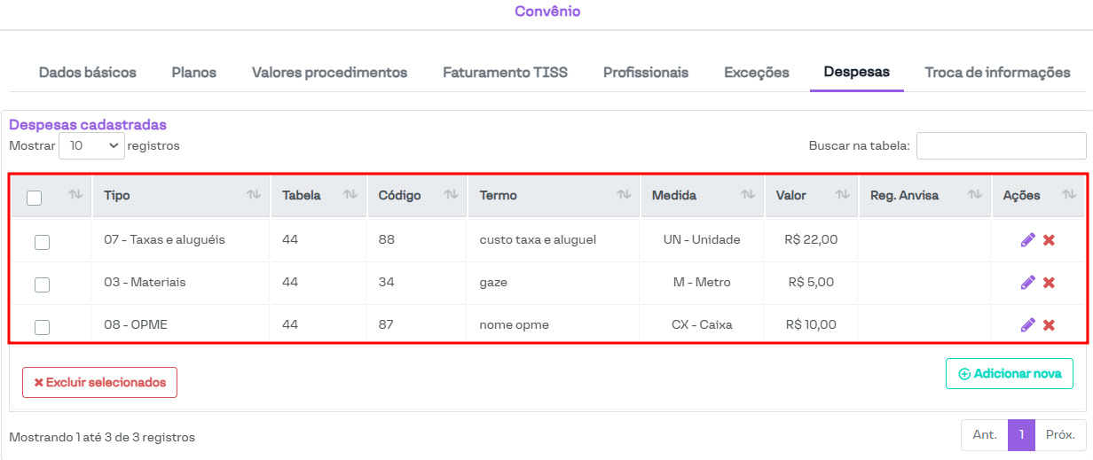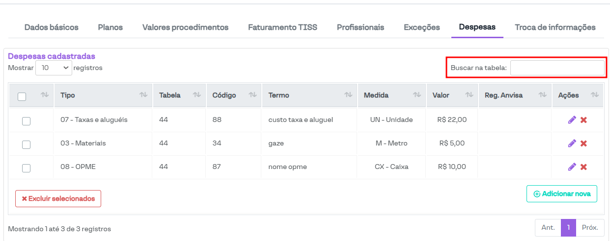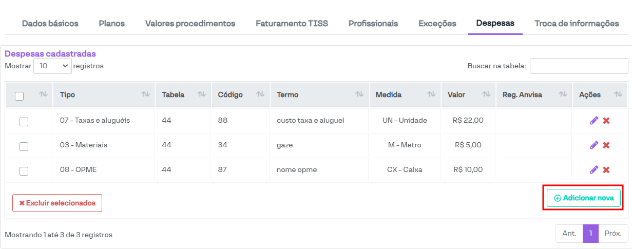 Nesta seção, é possível configurar procedimentos que não fazem parte das tabelas de procedimentos pré-configuradas (ou cujos parâmetros não estão de acordo com o necessário), além de cadastrar despesas utilizadas nas guias TISS.