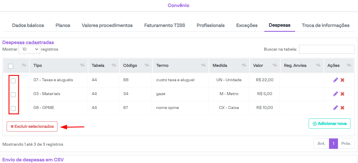 Também é possível excluir várias despesas selecionando os campos na coluna à esquerda e clicando no botão Excluir selecionados.