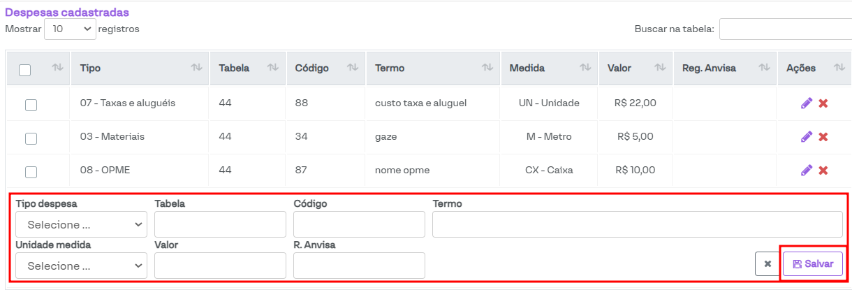 Na seção destacada na imagem abaixo, estão listadas as despesas cadastradas. É possível verificar as informações cadastradas e, na coluna Ações, você pode editar essas informações ou remover a despesa cadastrada.
