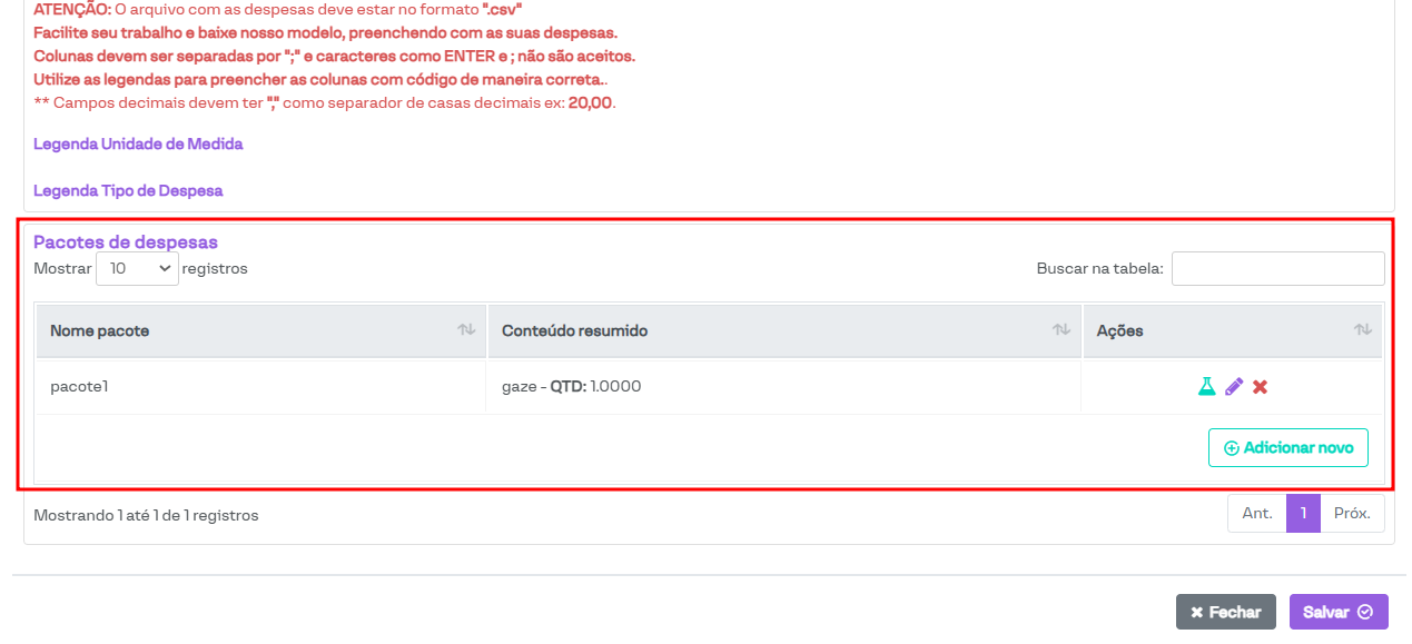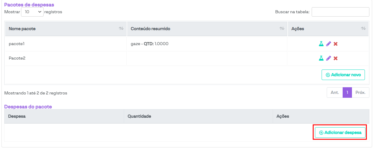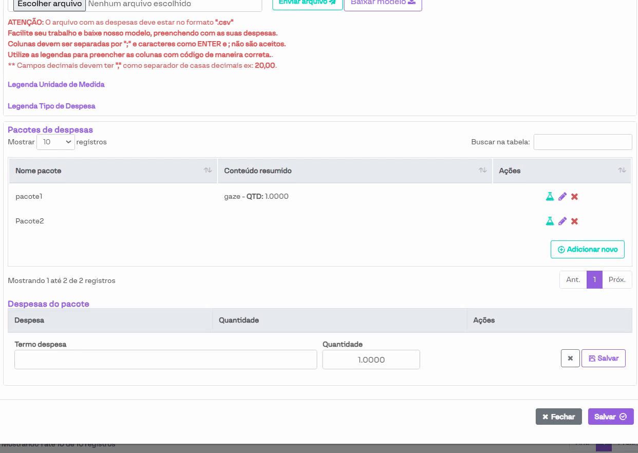 Nesta seção, é possível cadastrar um pacote de despesas. Cada pacote conterá os itens selecionados e uma quantidade pré-definida dos mesmos.