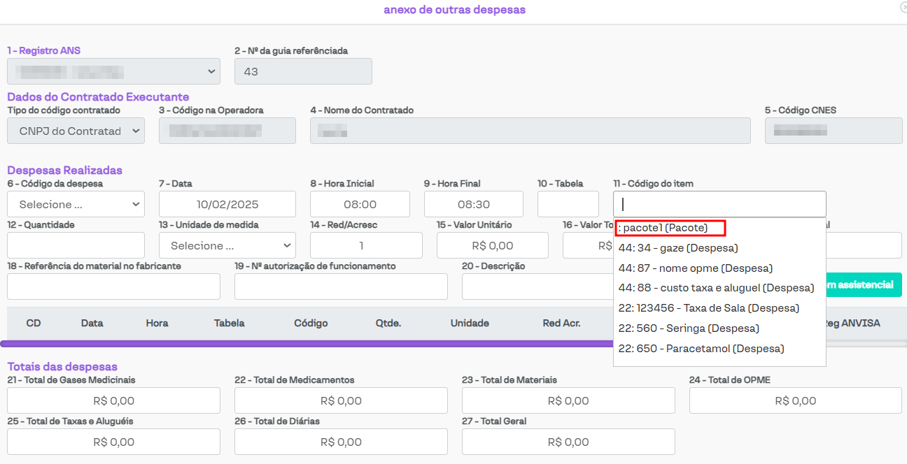 O cadastro desse pacote facilita o preenchimento de despesas em guias futuras, pois é possível selecionar um pacote de despesas pré-determinado, em vez de precisar incluir os itens um a um. O pacote poderá ser selecionado no campo Código do item na aba Anexo de outras despesas. Para identificá-lo, o pacote será exibido com a legenda Pacote ao lado do nome, conforme destacado na imagem abaixo.