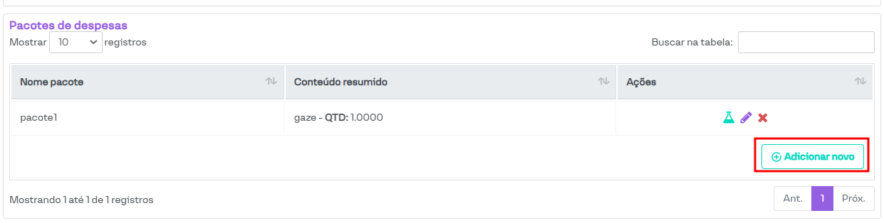 Para cadastrar um novo pacote, basta clicar no botão Adicionar novo, conforme destacado na imagem a seguir.