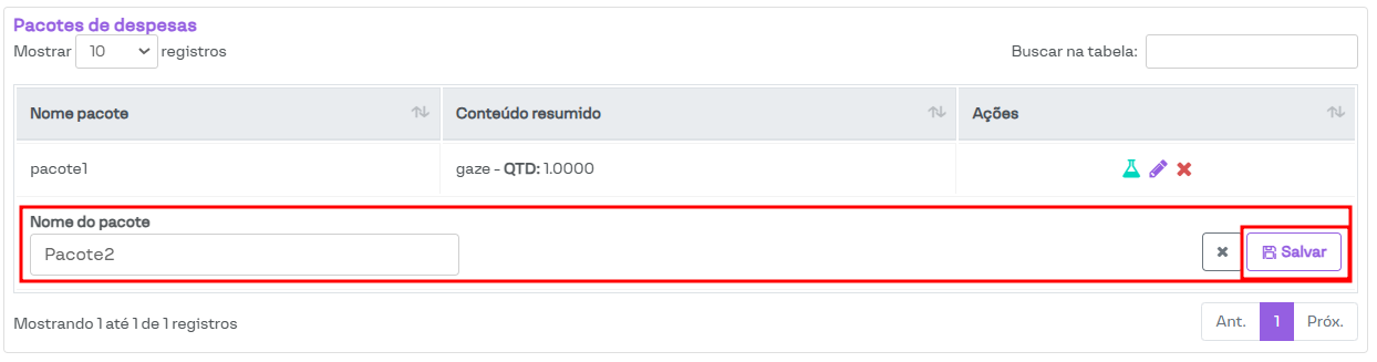 Será habilitado o campo para incluir o nome do pacote. Após preencher o campo, basta clicar em Salvar.