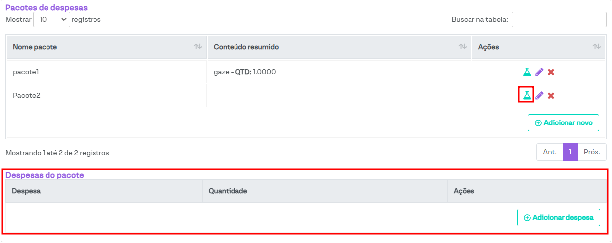 Para incluir os itens do pacote, basta clicar no ícone em formato de Erlenmeyer. Ao clicar nesse ícone, será habilitada uma nova seção, conforme destacado na imagem abaixo.
