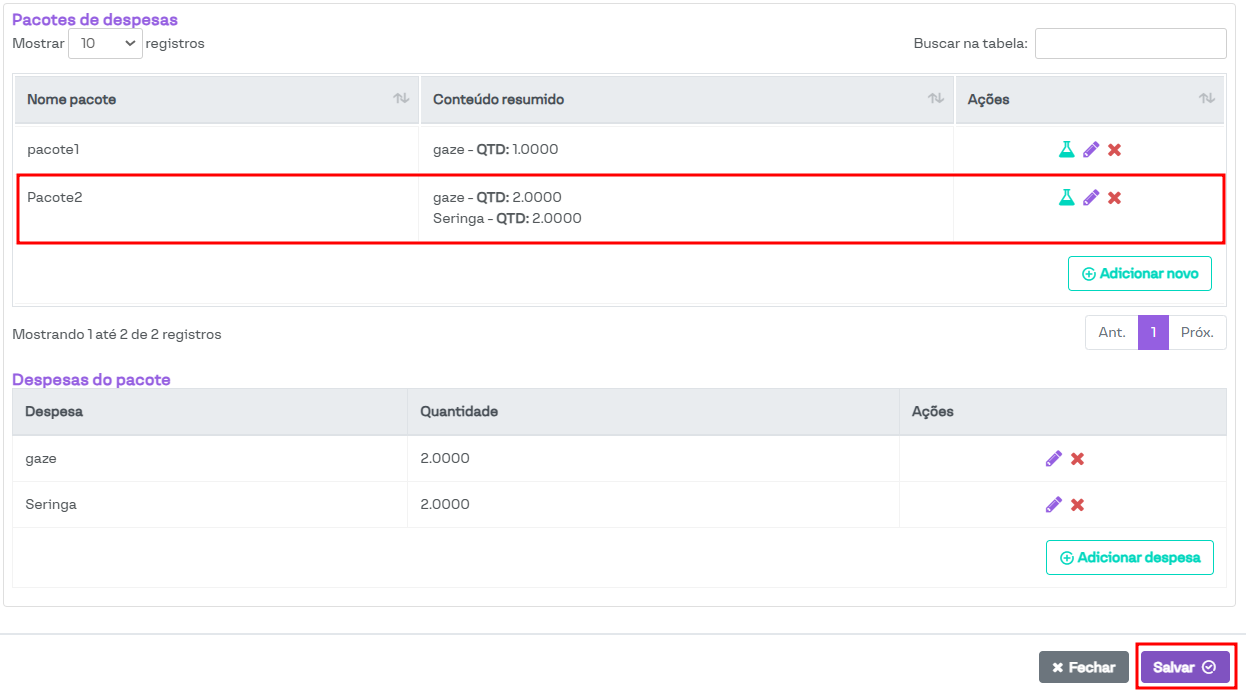 Após finalizar o cadastro, basta clicar em Salvar para concluir o pacote.