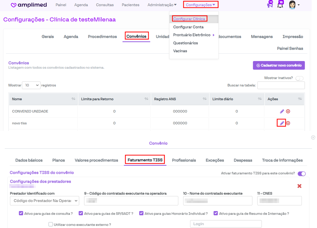 Acesse: Configurações > Configurar Clínica > Convênios > Editar convênio > Faturamento TISS