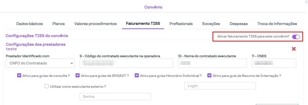 Para ativar o módulo TISS no convênio, basta selecionar a opção Ativar faturamento TISS para este convênio, conforme destacado na imagem abaixo.