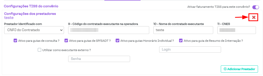 Ícone em forma de X: Ao clicar neste ícone, é possível remover o cadastro de um prestador de serviço. Vale destacar que o sistema não realiza a confirmação da ação ao clicar no botão.