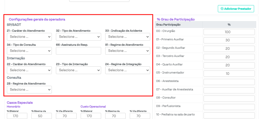 Nesta seção, será apresentada a parte onde é possível cadastrar e configurar os prestadores de serviço da operadora.