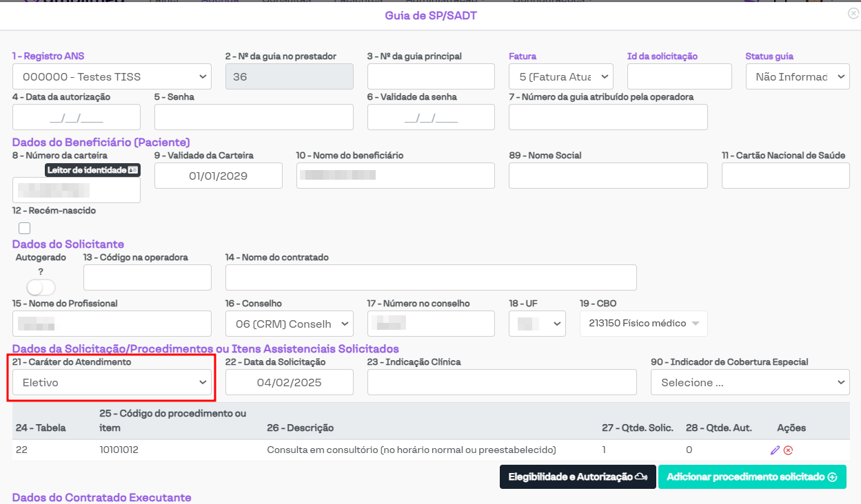 21 - Caráter do Atendimento: É possível selecionar entre as opções Eletivo e Urgência/Emergência. Esse campo está localizado no local destacado na imagem a seguir.