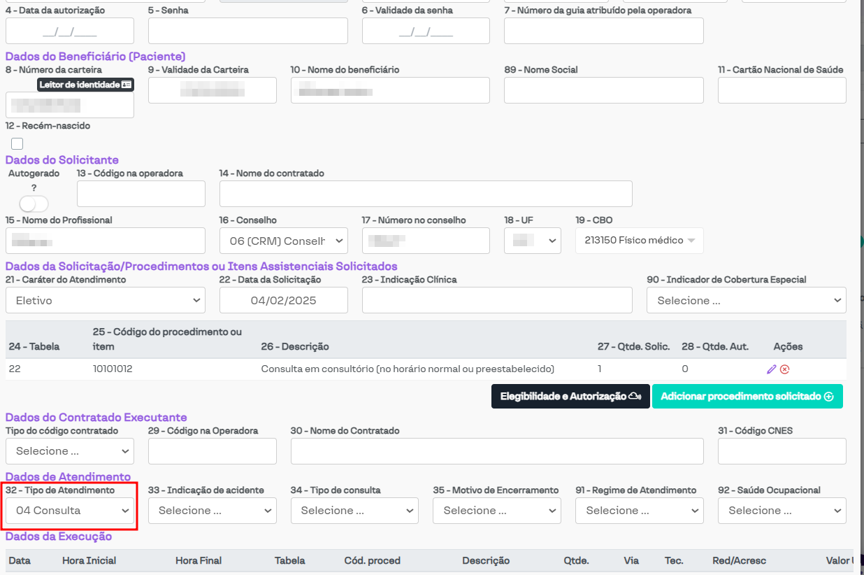 32 - Tipo de Atendimento: Permite padronizar o campo entre as várias opções disponíveis. O campo está localizado no local destacado na figura abaixo.