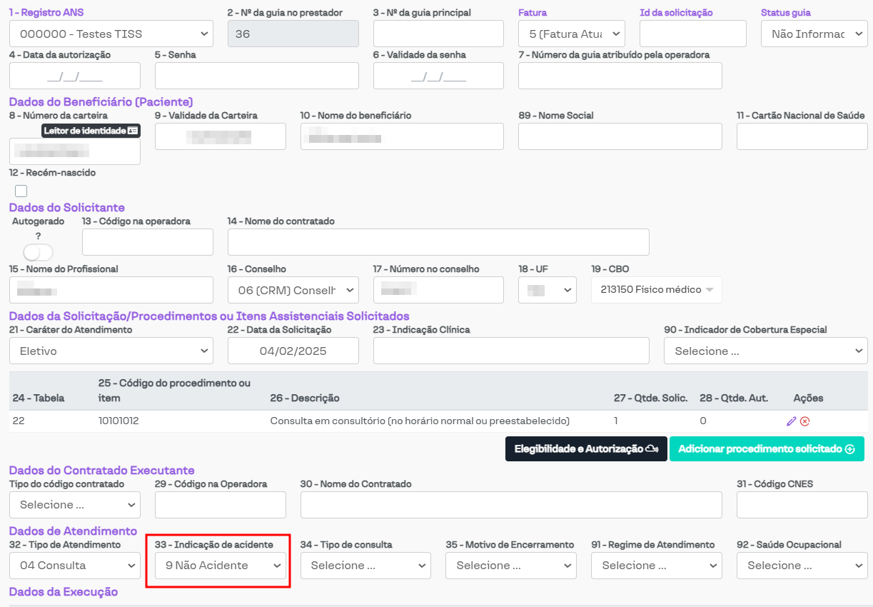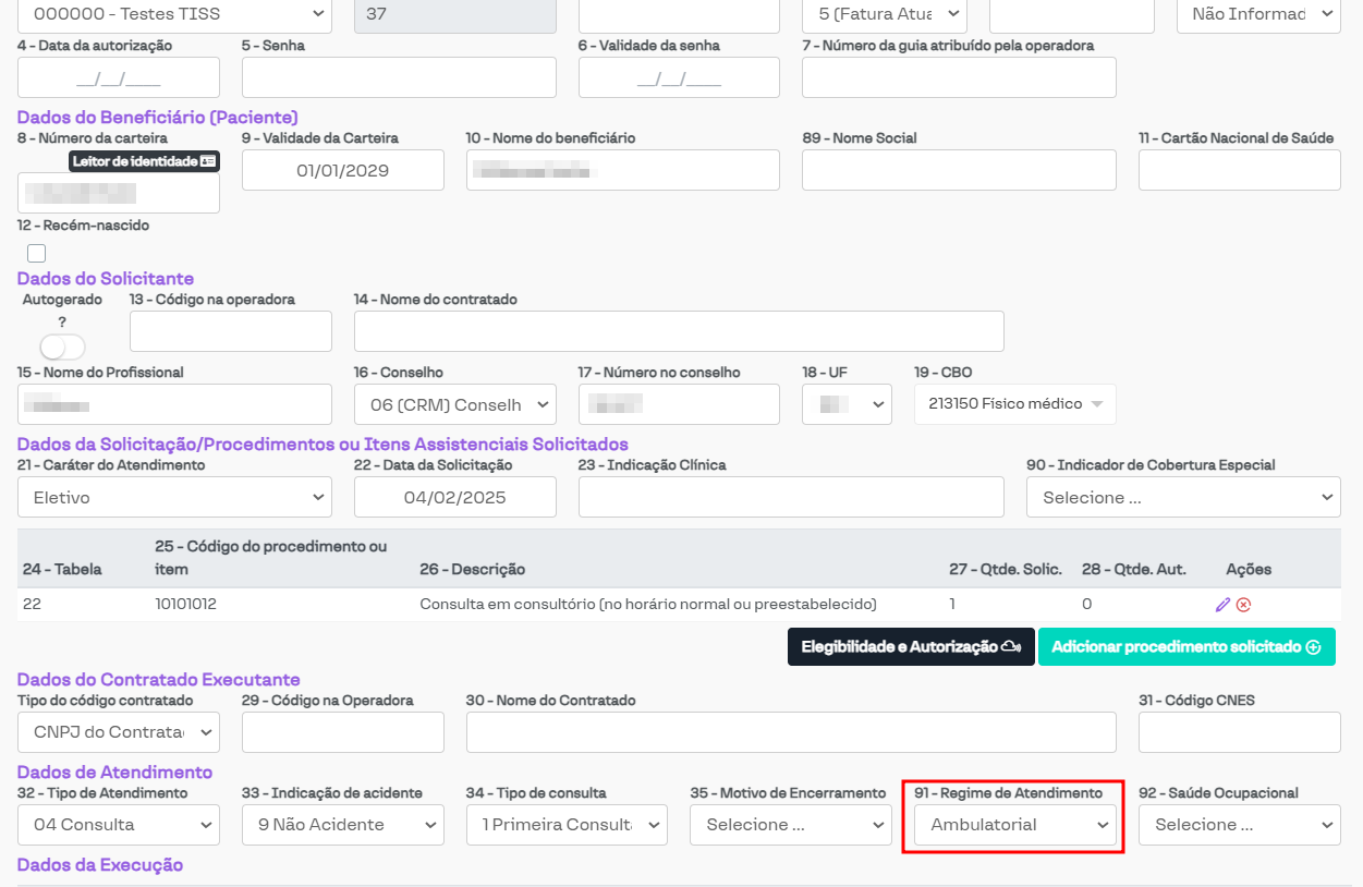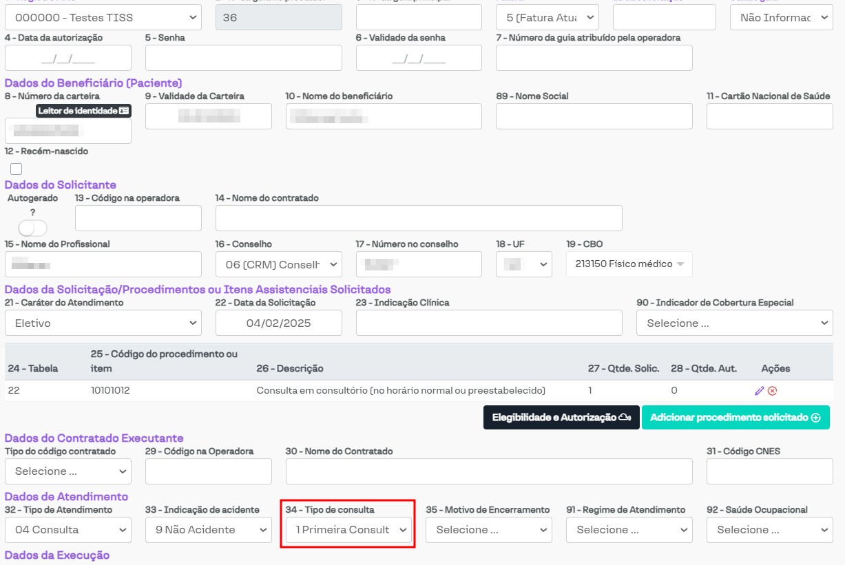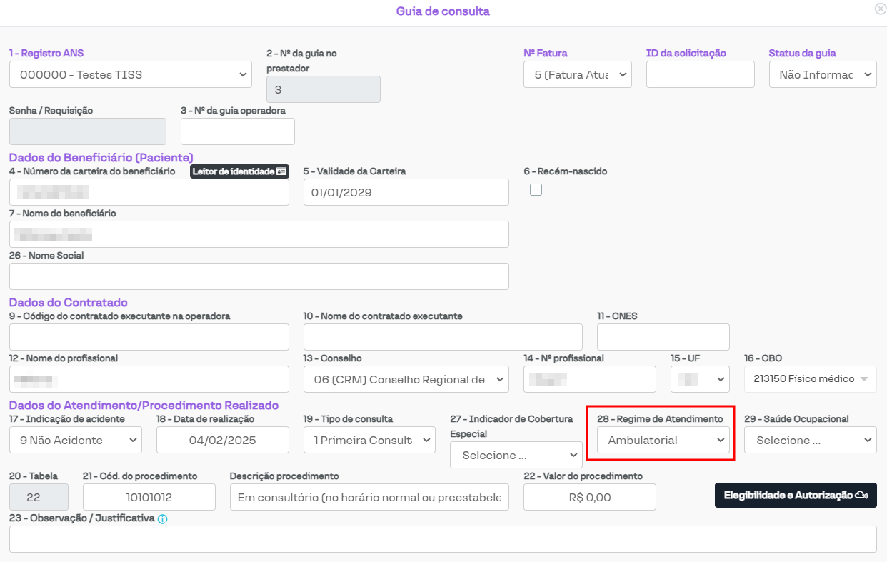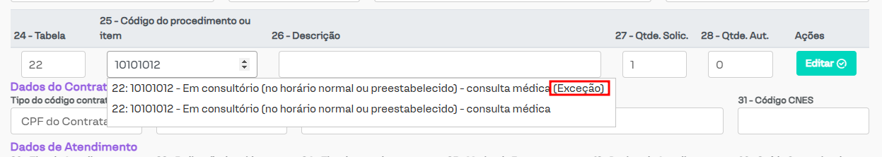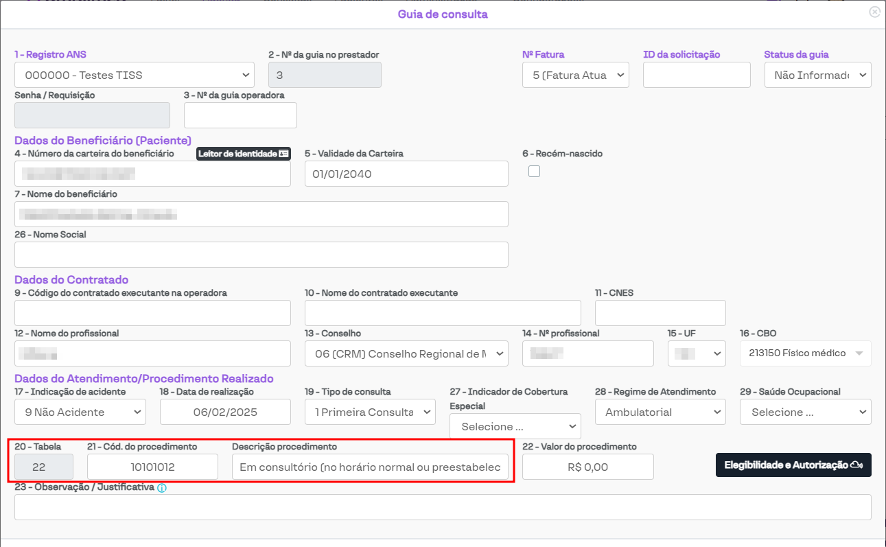 No caso da imagem acima, o procedimento configurado é o 10101012. Ao criar uma guia de consulta, esse procedimento será preenchido automaticamente, conforme mostrado na imagem a seguir.