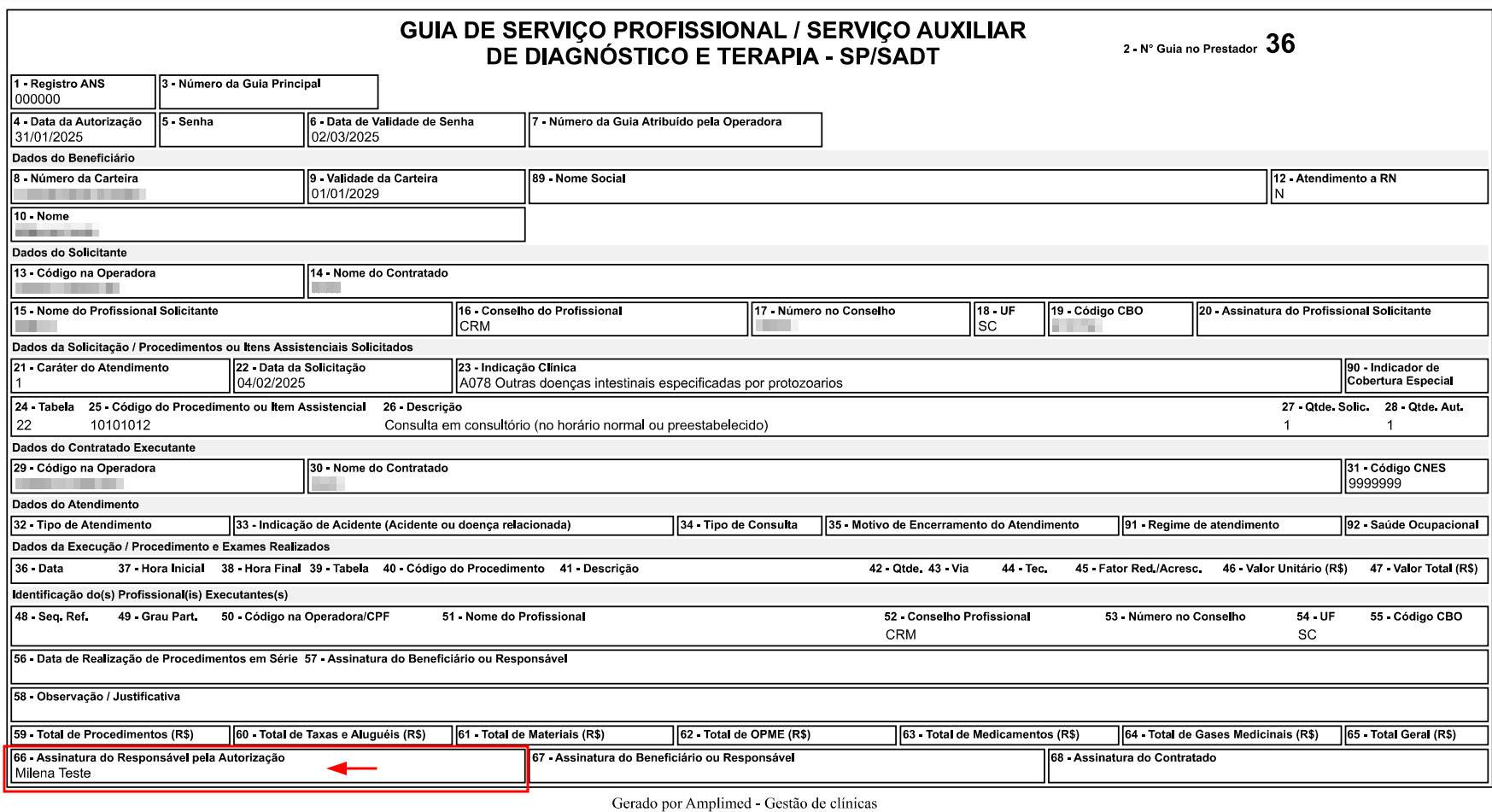 66 -Assinatura do Responsável: É possível incluir a assinatura, que será apresentada ao imprimir a guia. Ela será exibida no local destacado, conforme a imagem a seguir.
