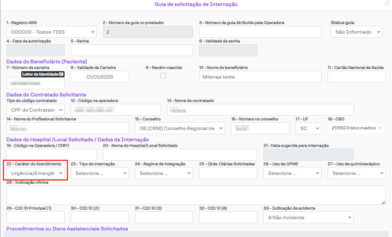 22 - Caráter do Atendimento: É possível selecionar entre as opções Eletivo e Urgência/Emergência. Esse campo está localizado no local destacado na imagem a seguir.