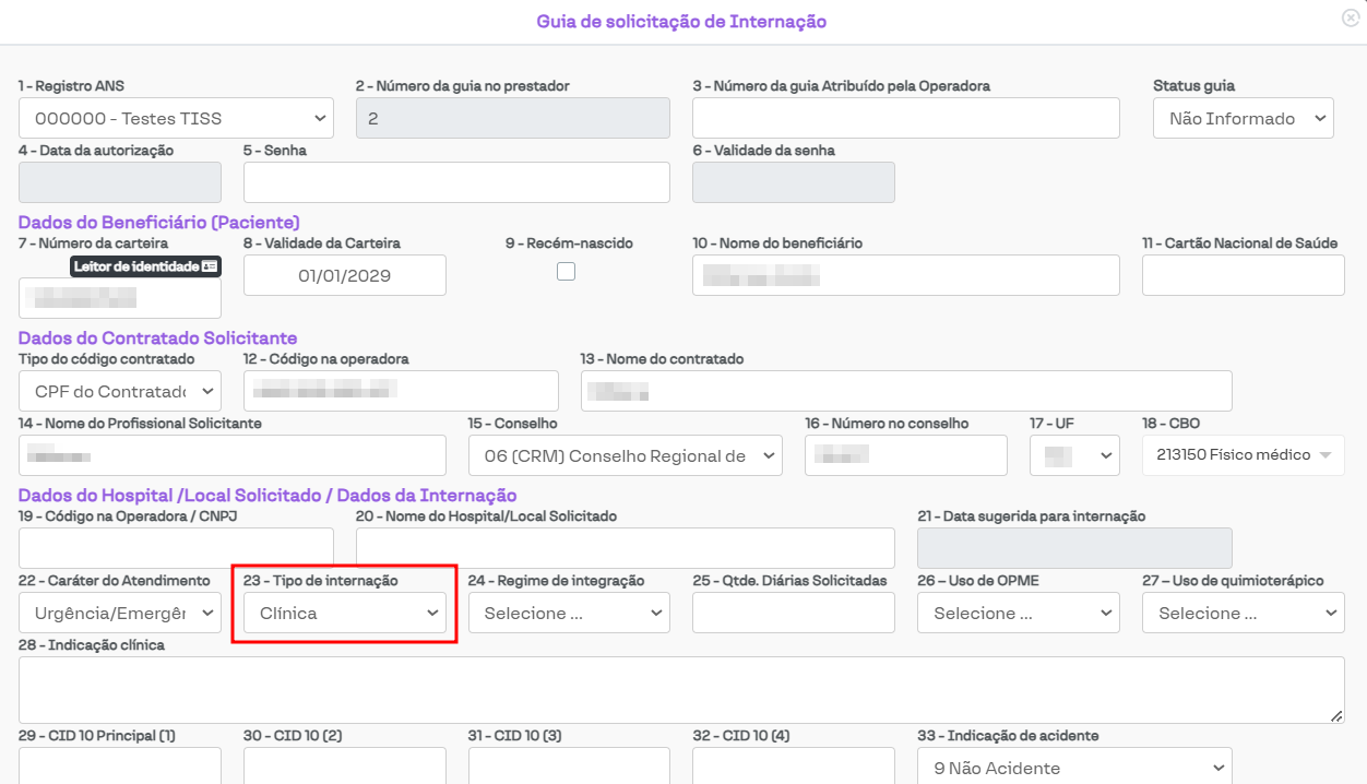 23 - Tipo de Internação: Permite padronizar o campo com as opções a seguir: