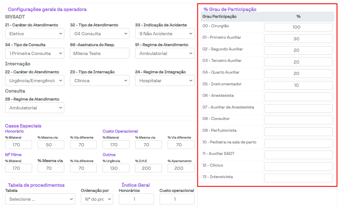 Nesta seção, é possível configurar o percentual do valor do procedimento que será repassado ao profissional, conforme o grau de participação das categorias.
